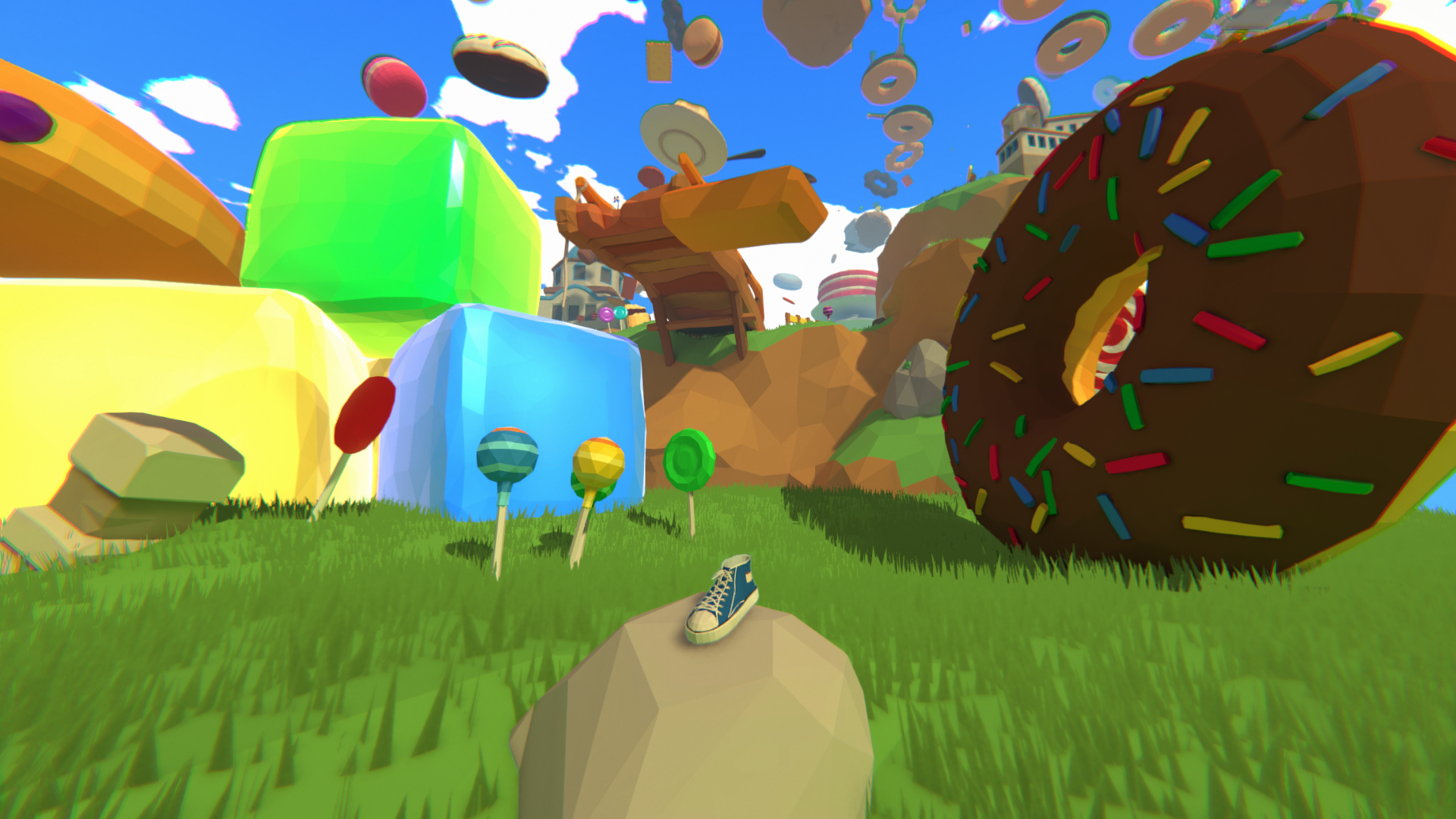 A platformer game where player kicks the shoe on a low-poly 3D world.
